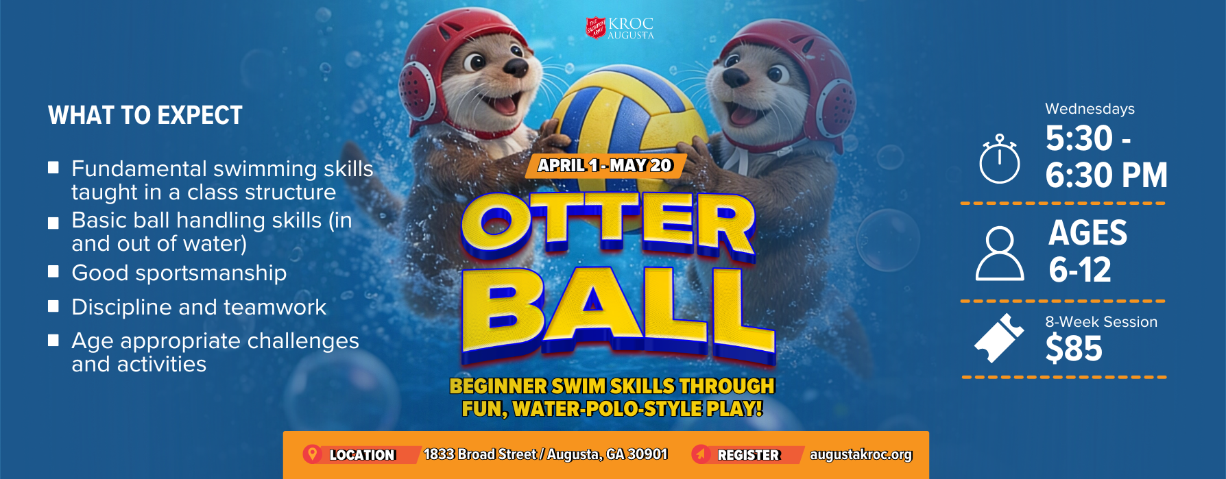 Participants will build water confidence, practice basic ball-handling skills (both in and out of the water), and develop teamwork, discipline, and good sportsmanship. Each session includes age-appropriate challenges designed to strengthen swimming fundamentals while making learning active and exciting.